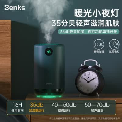 Beks 加湿器迷你小型家用办公室卧室孕妇婴儿桌面车载空调房净化Benks迷你加湿器,外形小巧不占地方,500ml水箱容量+液晶显示,可供持续喷雾8小时。硅胶底座,防滑不易倾倒。纳米细雾增加环境湿度。真心推荐大家购买!很实用,无声音,开心购物非常好哦,质量非常好,已经入手第二个了。挺好的,颜值很好,出?F量蛮大的。充一次电可以使用大概4个小时左右,当然是不打灯的情况下。水箱是500毫升的,加一次水基本可以用一个晚上。值得推荐。