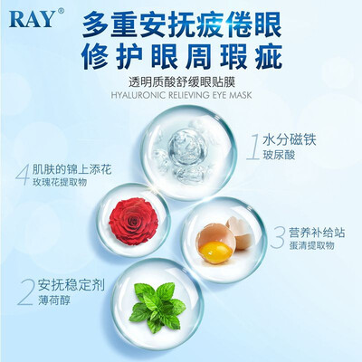 二、RAY透明质酸舒缓眼贴膜 10对盒 舒缓眼部疲劳 淡化细纹 补水保湿产品参数: