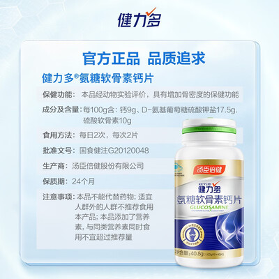 健力多(KEYLID)氨糖/软骨素经常购买,非常划算效果也很不错值得推荐。商品质量好而价格低,优惠力度大,很热情的卖家,下次还来希望下次还有机会合作祝你生意兴隆质量非常好,出乎我的意料包装非常仔细。下次有机会再找你,店家人蛮好的,东东很不错。吃了一段时间才来评价的,感觉很不错。吃完再来购买一直买的这个品牌,补钙有效。之前爱抽筋,吃了一段时间,有明显改善。质量一如既往地没得说,价格便宜,经常有活动,父母膝盖疼,吃了几瓶就不疼了,我又帮同事买了很多次,物流也挺快,还有送的小药盒,用起来也很方便,平时在药店买两瓶的价格,现在就能买到五六瓶,价格相当优惠。。。。非常好
