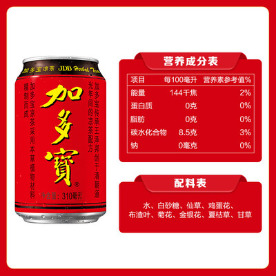 二、加多宝凉茶310ml12罐礼盒装草本凉茶植物饮料(新老包装随机发)产品参数: