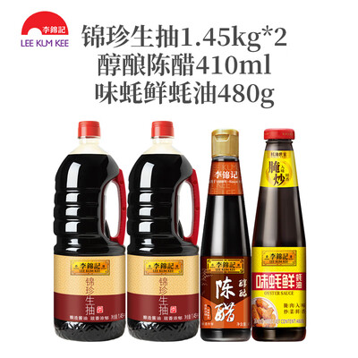 李锦记 锦珍生抽1.45kg2+醇酿陈醋410ML+味蚝鲜480gL李锦记酱油和耗油收到了,老牌子了,李锦记生抽酱油做凉拌菜味道很好。快递第二天就收到了,包装好,不错的产品,值得购买。做活动买的,价格实惠,蚝油不错,酱油一般般家里一直吃的都是李锦记的调味品,口味很棒