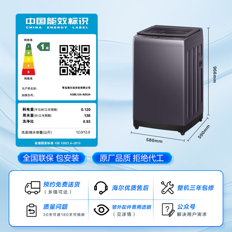 统帅(Leader)海尔智家出品波轮洗衣机全自动 12公斤直驱大容量懒人必备 国家补贴 超微快净魔方 XQBL120-BZ636到手价格1079.2元。
