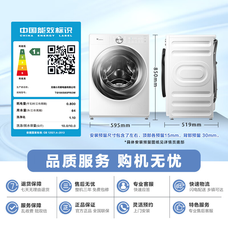 从送货到家起至安装结束在小时内全部搞定。使用期间很安静,不会引起烦躁感。可以远程控制和调整,及时通知洗涤结束,掌握进程。外形外观:很喜欢,简单漂亮上档次洗净效果:洗的衣服干净除菌效果:功能强大容量大小:容量大洗衣机小天鹅洗衣机TG100S83PROW仅外观时尚,而且洗涤效果出色,噪音控制得也很好。操作起来简单易懂,节能省电,真是既实用又环保,给我们的生活带来了很大的便利买回来半个月了,洗衣机和烘干机,南方的天气真的很需要,烘干机,操作简单方便,外观也还不错洗衣机外形简洁大气,功能齐全,一级能效,操作简单,洗衣服的时候声音也很轻,洗完衣服很蓬松没有任何缠绕,非常好的洗衣机!