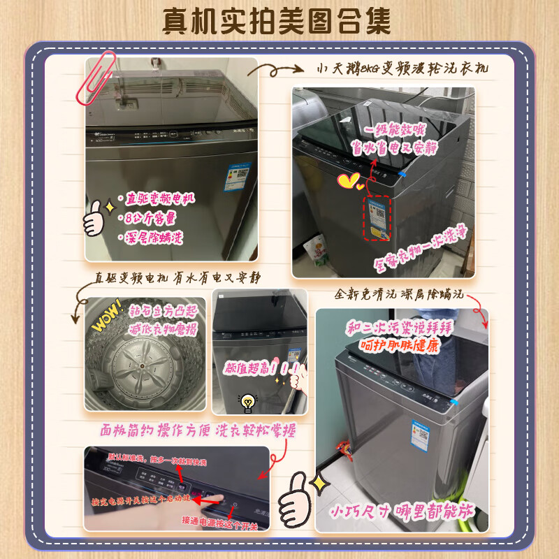 新品洗衣机太好看了,特别是透明的玻璃盖子,洗衣服一目了然,声音超小,比以前买的好好几个档次,不错,值得购买,还能除螨外形外观:好看洗净效果:超干净除菌效果:很好容量大小:够大发货速度快,一直都信任洗衣机洗衣机小天鹅TB80V23DB外形外观:小巧玲珑洗净效果:效果不错容量大小:嗯,刚刚好适合小户型清洗,效果不错,一家三口的都能洗,而且价格也很便宜优惠收到了,洗净效果:洗得很干净外形外观:很大气,很漂亮除菌效果:洗得很干净,除菌效果也很好买了三个洗衣机都是的,包括朋友推荐都是,双十一买的超级划算,明年装修房子准备再买一个,洗的很干净,噪音还小,很好用哦!