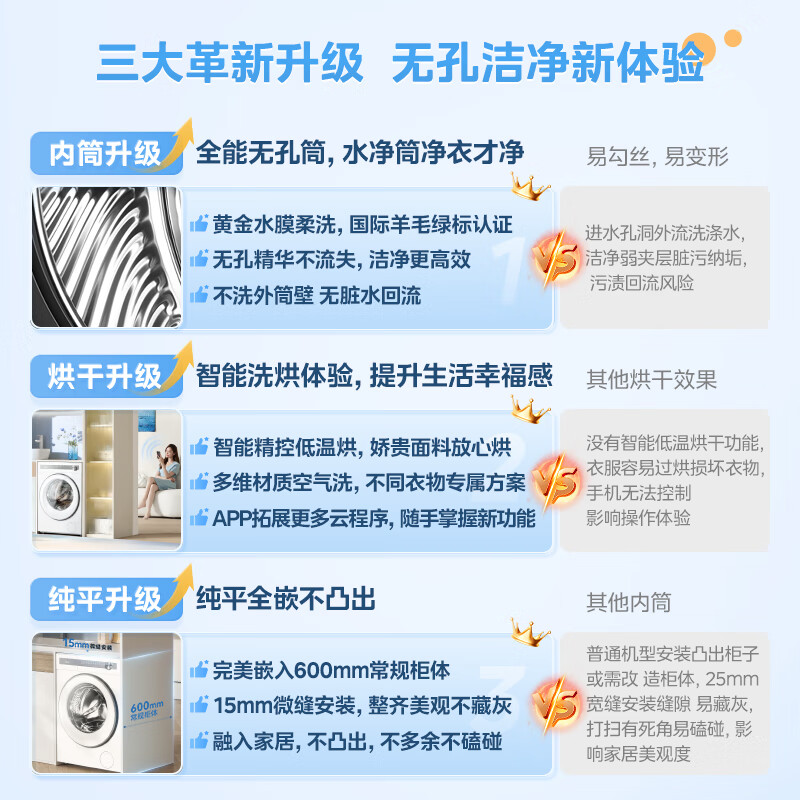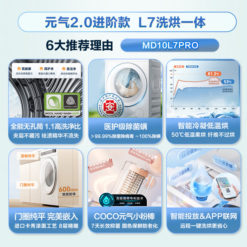 纯平嵌入,系列!超级好看!试用了一下声音也不大,清晰的很干净!超级喜欢!还是洗烘一体,功能也非常多!爱了爱了!下次还买洗衣机到了一周啦!效果挺好的,大小也合适!用久以后再来追评论,暂时是很不错?可以购买!洗衣机美的MD10L7PRO洗衣机很轻,.公斤的,适合两个人,洗衣服洗'重的也可以,甩干都还可以,容量夏季衣服可以洗四五件,也洗的干净,总体可以宝贝看着不错,外形外观靓丽,我们电器产品几乎都是了。希望以后使用中能有极为满意的效果。非常满意,我一年前买了一个,现在还在用,质量很好,动力强劲,空间大,甩干桶也很大,今年又给我妈买一个,又给老家买一个,