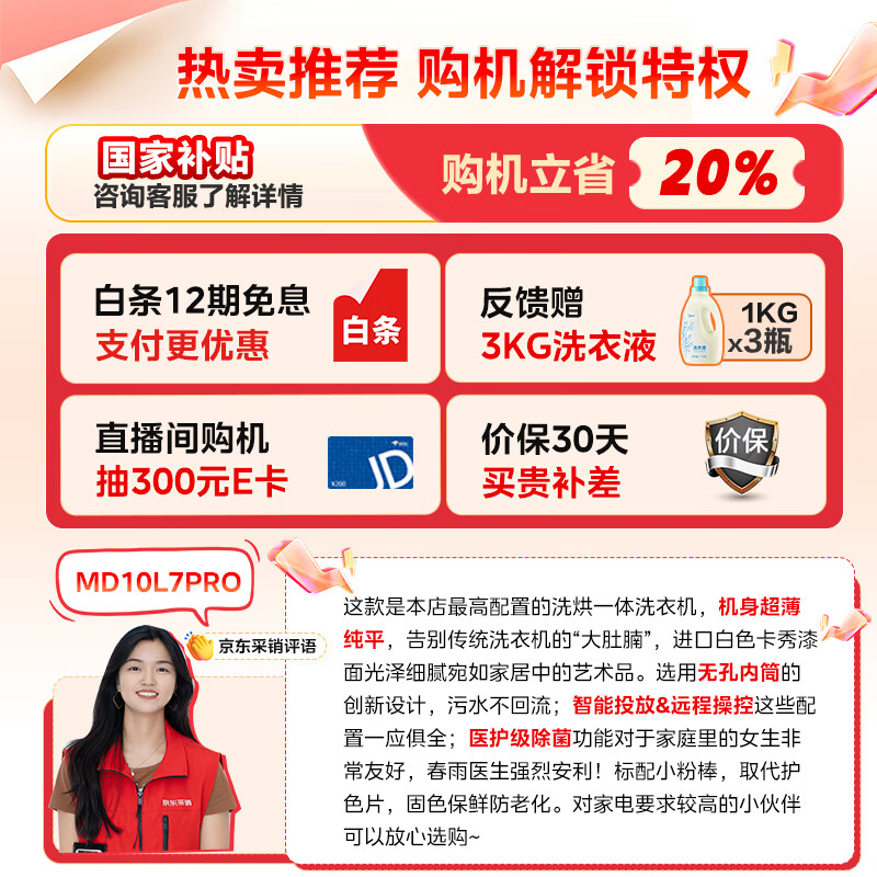 美的(Midea)滚筒洗衣机全自动家用 MD10L7PRO 10公斤洗烘一体机 纯平全嵌 元气2.0 以旧换新 家电国家补贴20%到手价格4599元。