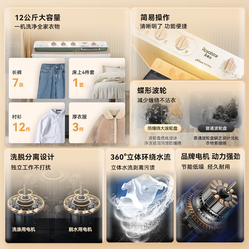 荣事达(Royalstar)洗衣机 12公斤双筒家用双缸半自动双桶洗衣机大容量甩干机 以旧换新 RP12030J到手价格609元。