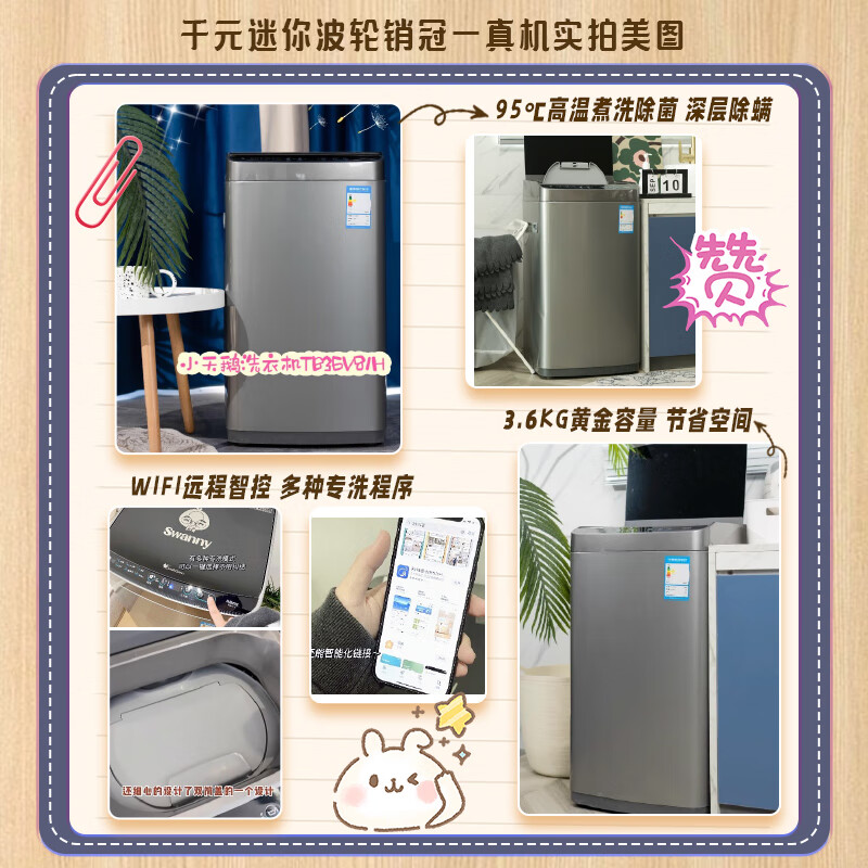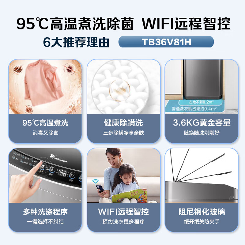 小天鹅TB36V81H非常好的一款小型洗衣机。买来给孩子洗衣服 刚好跟大人的分开,声音也很小 方便用,两边扶手很轻易就抬起来了 可以随意挪动洗衣机收到了,物流很快,质量很好,物美价廉。是正品,和实体店一样,价格还优惠,果断转粉。洗衣机安装好了,试了才来评价。挺好的,也没什么声音。洗衣服也干净。特别实用的一款洗衣机,需要的不要犹豫。客服人也很好家里前面买了一台,外形看着挺好的,有消毒洗功能,还有快洗功能,价格也实惠现在再购置一台在上买了好多台洗衣机了,基本上都是滚筒。这一次主要是父亲特别要求买的定频波轮洗衣机,而且是大容量,用了几天还比较满意。