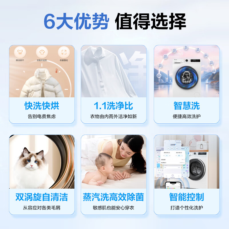 洗衣机统帅XQG100-LHD559WU1哪个好?区别是什么?其实这个统帅(Leader)海尔智家出品 云朵滚筒洗衣机全自动10公斤洗烘一体以旧换新 家电国家补贴 XQG100-LHD559WU1非常nice的,独特的造型设计和外观,做工十分考究,不少人想要知道这个统帅XQG100-LHD559WU1怎么样?质量好不好?说实话这洗衣机统帅XQG100-LHD559WU1使用体验后个人感觉蛮可以的哈,我自己也是才购买没多久的,外形外观:小巧精致,颜色好看干净,操作简单,占地不大,易搬动洗净效果:动力十足,洗的很干净,洗净速度挺快,半自动比全自动的就是快,省水省时除菌效果:不知道容量大小:公斤的挺大的,我今天洗床上四件套正好,甩桶也很好,脱水很干,就是噪音有点大,毕竟是半自动的,能接受物流也很快,送货的很热情帮着搬到屋里 洗衣机统帅XQG100-LHD559WU1质量非常好,完全超出期望值,发货速度非常快,包装非常仔细、严实,很满意的一次购物,给父母买的,用不惯全自动,所以买这个啦 洗衣机看起来很好看,高度合适,使用过程中,声音也比较小,没有晃动现象,子母分区洗很合适 宝贝收到了,很惊喜,质量非常好,很满意的一次购物。小巧玲珑,不占地方,我家小房子也能放得下,操作时声音不大,脱水很方便。 很满意,这款洗衣机真是太方便了,一键启动,洗烘一体,省时省力。洗出来的衣服也特别干净!
