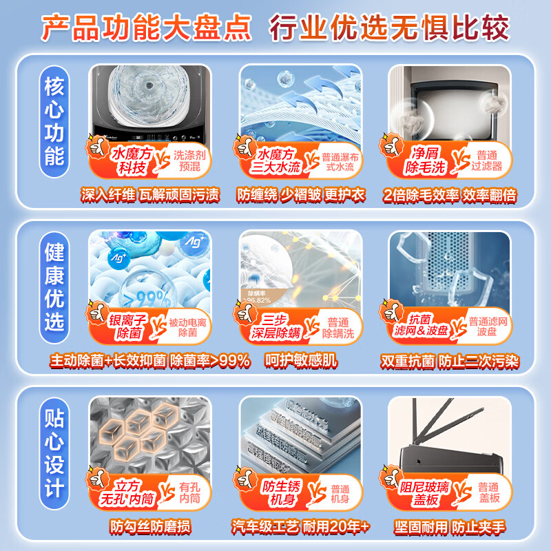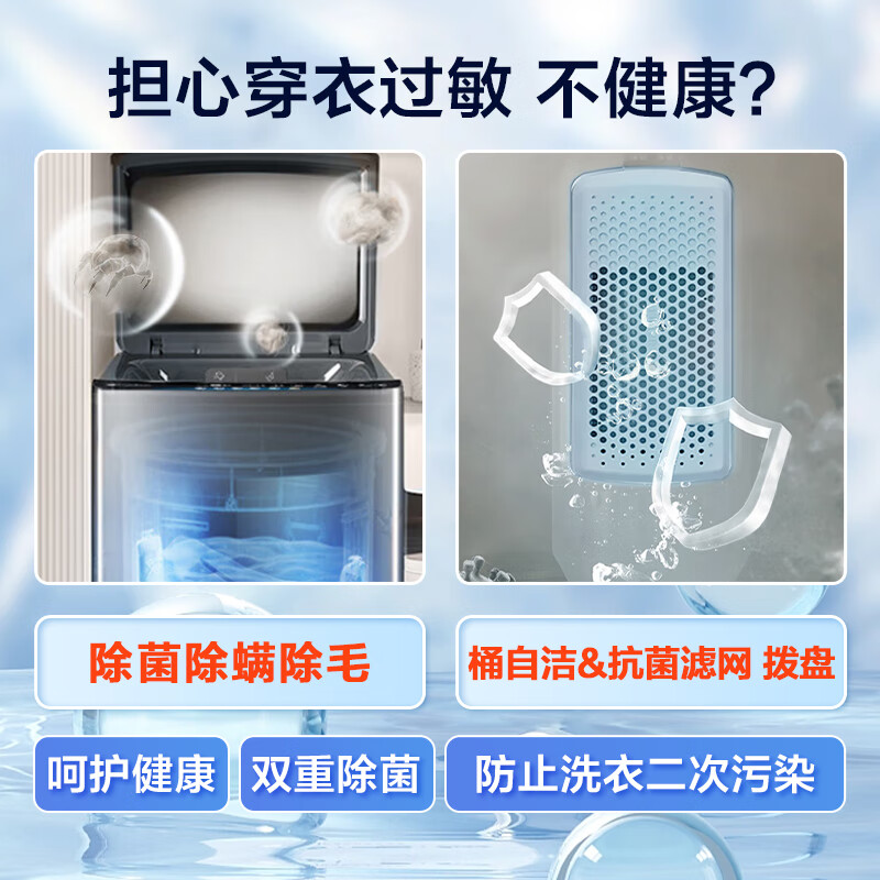 除螨洗,儿童安全锁,防缠绕,排水阀漏水保护,筒自洁,预约功能,中途添衣,除菌功能