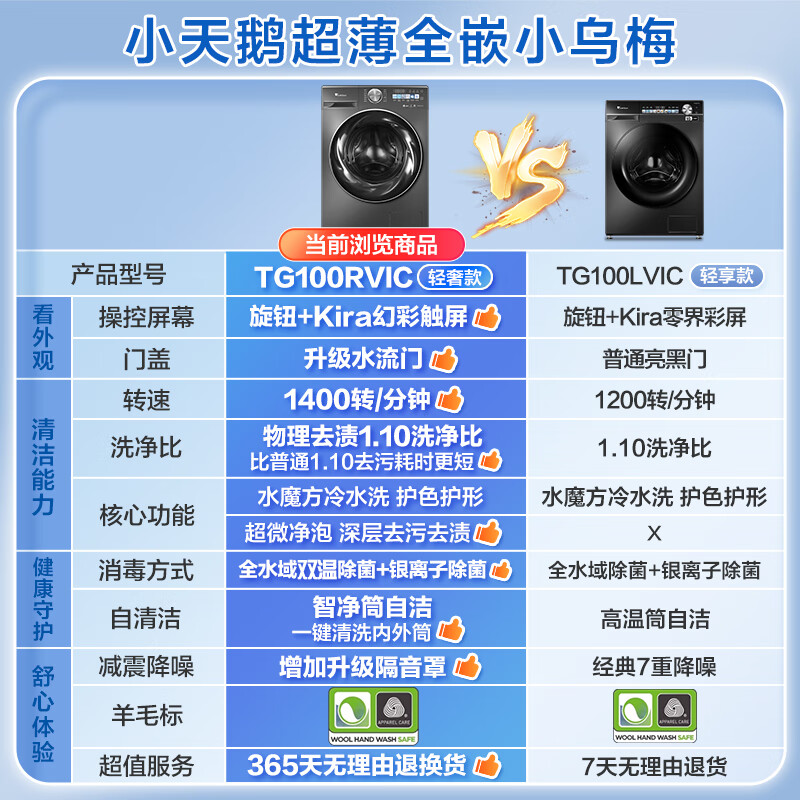 洗衣机小天鹅TG100RVIC哪个好?区别是什么?其实这款小天鹅(LittleSwan)滚筒洗衣机全自动家用10kg大容量超薄全嵌水魔方Ai智能投放小乌梅TG100RVIC以旧换新国家补贴20%的确很OK的,卓越的造型设计风格,做工非常细腻,不少网友想知道这款小天鹅TG100RVIC怎么样?质量靠谱吗?说实在的这款洗衣机小天鹅TG100RVIC使用体验后个人感觉蛮不错的哈,我自己也是才买不久的,外形外观:小巧,不占空间,很漂亮,操控很方便,外观设计简约大气,外观一目了然,清新舒适。洗净效果:很好,清洗的很干净,洗了第三次了!效果也比旧机好很多!省水省电除菌效果:很棒,很好的洗衣机的话,带免清洗功能的这个的话它不容易滋生细菌容量大小:.很适合清洗婴儿衣服,洗衣机大小合适没什么声音,特别满意啦! 洗衣机小天鹅TG100RVIC外观很亮,跟家居风格很搭~尺寸也很合适,能用过之后觉得很好,不管是速洗还是大件都能感受到澎湃的动力,洗的也很好很干净 比想象中好要好用 比较相信老牌子 方便 客服也很耐心解答 洗的声音也不大 可以放心入 洗衣机这个品牌我很喜欢,一直想换一台洗衣机,这次趁着有国补置换一台,依旧换新,外观设计大气,噪音小,节水节电,价格很香。 发货速度很快,洗衣机不错,安装很及时,功能很好用,很棒的一次购物体验,下次再来,赞一个!