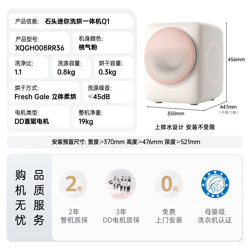 洗衣机石头XQGH008RR36哪个好?有什么区别?实际上这款石头迷你洗烘一体机Q1桃气粉 全自动儿童婴儿内衣滚筒烘干洗衣机 0.8kg公斤 补贴 干衣机XQGH008RR36的确蛮可以的,新潮的造型设计风格,做工非常讲究,不少人想要知道这个石头XQGH008RR36怎么样?质量好吗?说实在的这款洗衣机石头XQGH008RR36已经使用过一段时间个人感觉可以的,我自己也是才入手不久的,洗衣机非常干净,洗衣服时可以洗得非常干净,不需要再使用洗衣粉和柔顺剂。洗衣机的容量非常大,可以一次完成大量的衣物洗涤,非常方便。洗衣机的噪音很小,在家里使用时可以享受宁静的生活。使用洗衣机洗衣服可以节省时间和水资源,非常环保。洗衣机的设计很人性化,可以自动调整洗涤方式、温度和水位等,非常方便 洗衣机石头XQGH008RR36买的,延迟发货了很久,原来买的型号断货换了其他的型号,才安装上,跟我们定制的柜子挺合适的,盖子也不怎么突出,比较美观。 壁挂洗衣机,母婴健康守护,纳米银离子+℃煮洗,智能省空间!小巧百搭,贴身衣物专用洗护! 大小合适。抬起来整机不重。地不平还可以调节。运行时声音大小还可以算是可以接受。快递直接送到家里。当天下单第二天就算到了。 洗净效果:洗的衣服很干净,外形外观:是我喜欢的颜色除菌效果:还可以除菌容量大小:容量很大