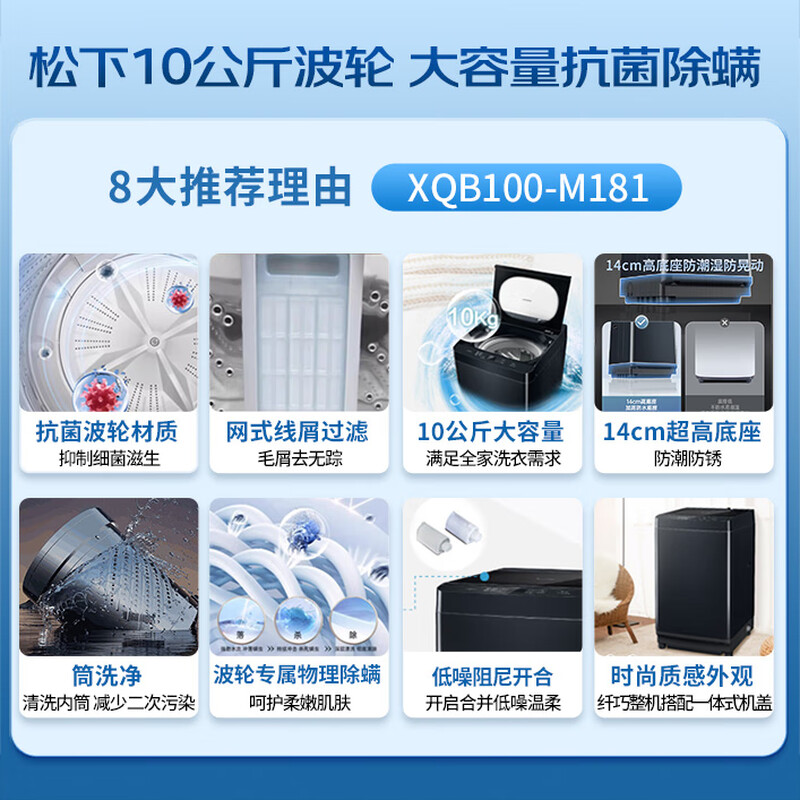 松下XQB100-M181外形外观:美观大方,洗净效果:不错,漂洗 脱水声音非常小,物流配送很快,安装师傅细致周到 很满意的一次网购 给五星好评洗衣机收到了,店家发货很快,物流也很快,安装很及时,在大平台购买还是有保障的,很满意!非常不错,使用这款洗衣机后感觉省心又省力,洗衣服变得轻松多了。自洁功能也很实用,让我用得更放心,价格也很合理,性价比高。很满意,真的是超级好卖家,解答疑问不厌其烦,细致认真,关键是东西好!以后会继续关注的。非常满意的洗衣机!外形外观:酷炫高级洗净效果:挺干净的容量大小:非常能装 大小很满意!以旧换新:以旧换新很快 价钱划算