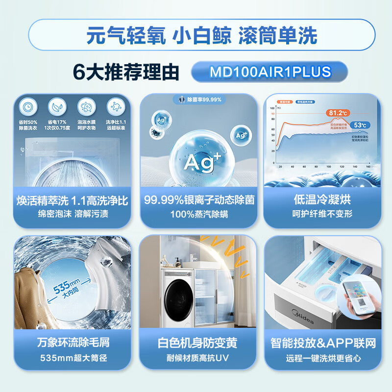 洗衣机美的MD100AIR1PLUS哪个好?区别有吗?这款美的(Midea)滚筒洗衣机全自动家用 MD100AIR1PLUS 10公斤洗烘一体超薄 焕活精粹洗 以旧换新 家电国家补贴20%的确是蛮不错的哟,华丽的设计造型风格,做工讲究,有网友想了解这款美的MD100AIR1PLUS怎么样?评测好吗?说实话这款洗衣机美的MD100AIR1PLUS体验过一段时间后个人觉得可以的哈,才买没多久的,昨日上午下单,今天早上就收到了。双桶洗衣机,半自动 ,大容量双缸洗衣机,洗脱分离,喷淋漂洗科技,流线蝶形波轮,外形美观大方,全塑箱体不怕水,轻便易搬动,洗涤时衣物缠绕少,洗衣洁净效果好。而且洗、脱可以同时进行,省时省力,太方便了。恰逢双十一大促,价格比平时优惠许多,性价比超高。非常满意! 洗衣机美的MD100AIR1PLUS今天送到了,试一下,洗衣力度不够,太轻,不能翻转洗,不知道网上有那么多人好评是怎么来的,之前老款,可以把衣服荷包翻出来洗, 大小合适,一般的洗手间都能放下,颜色也是我喜欢的,送货也很快,噪音也很小。超级超级喜欢 挺好的,每天使用频率很高。买来洗宝宝的衣服,可以连接,使用起来有很多程序,非常方便。宝宝的衣服粘上?用煮洗洗的非常干净 机器很好,工作声音不大,洗得也干净,外观很时尚大方,选这台洗衣机没选错,家人都说好。