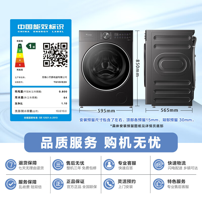 小天鹅TG10VE20滚筒式洗衣机,外观设计漂亮大气。放在洗衣机位置上也刚好,颜色很好看。洗衣服也很干净,各种模式对衣服也不伤害。上排水也很好用了一段时间才来评价的,洗衣机容量很大,能洗很多物品。质量也很好,完全可以放心选择。冼烘套装外观漂亮大气,洗净效果好,运行平稳噪音小,烘干功能强大,快速干不伤衣物。安装师傅认真负责,是一次完美地购物体验。洗衣服很干净,商家态度良好。一次能洗很多件衣服一次能洗很多件衣服。外观看上去很高大上一直都买的洗衣机 质量没的说!外观大气上档次 安装大小合适 很不错!客服人员人也好 细心讲解 京东购物就是方便贴心!