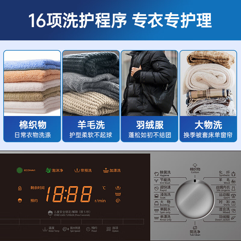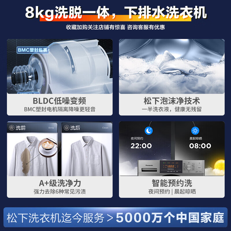 公斤能洗的特别多,一次性能把一家子半个月的衣服都洗了,家里人特别满意,都以为我花上万买的,我一说价格都吓一跳,简直完美这个价格买到洗烘一体的简直太超值了,因为家里还没装修完 所以膜还没撕,但是颜值依然很高哦洗衣机松下XQG80-ESN81是京东物流配送的,物流搬到指定位置,机子是大牌子,安静又好用。买的是带烘干功能,现在夏天连场的雨,这个功能很不错,有用!非常好!性价比高、品质也好!洗净效果:干净除菌效果:牛容量大小:非常大了家庭使用很好外形外观:白色很漂亮,材质也很好洗净效果:动力足,漂洗的很干净除菌效果:新机器,目前看不出来容量大小:适合一家人使用