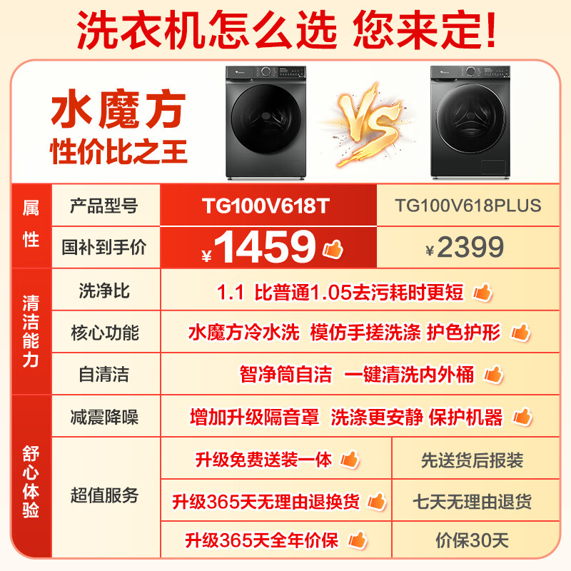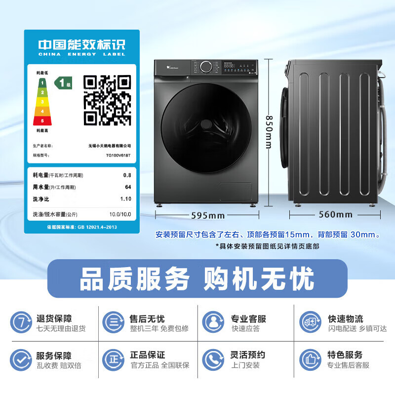 小天鹅TG100V618T公斤超级大的桶,喜欢,一家四口的衣服放进去还有很多空间,洗毛毯都足够大,还是大空间的好用,声音也挺安静的,性价比很高哦。客服态度好,回复及时,洗衣机容量大,噪音小,衣服洗的很干净,洗衣机是一款不错的选择哦。这款洗烘套装断断续续有货,赶在大促期间抢到了,双十一加上国补的价格很香,一秒钟都不敢迟疑,直接下单,期待安装后及使用效果。洗衣机收到了,太惊艳了,外观大气,是我喜欢的颜色,使用了一下,声音小,洗的干净,还很节能在同等商品里做了价格功能的比较,外观也很漂亮,而且是我想要的超薄的不占地方,适合家里比较小的卫生间这种设计非常的棒?!