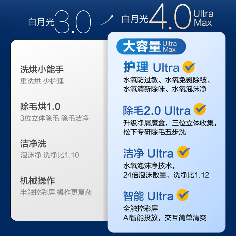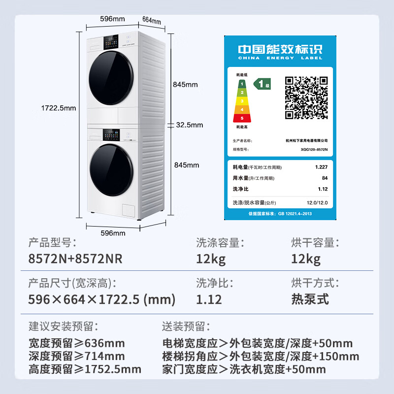 松下(Panasonic)【吴磊同款】白月光4.0UltraMax 洗烘套装 12kg滚筒洗衣机+12kg热泵烘干机 8572N+8572NR 国家补贴到手价格11499元。