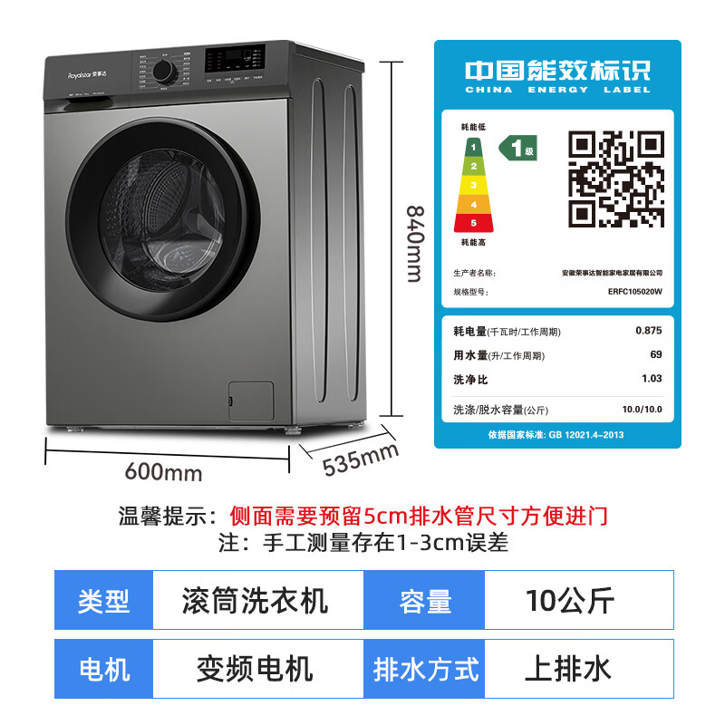 荣事达(Royalstar)洗衣机全自动滚筒10公斤变频除螨一级能效智能预约家用 送装一体 家电国家补贴ERFC105020W到手价格1169.1元。