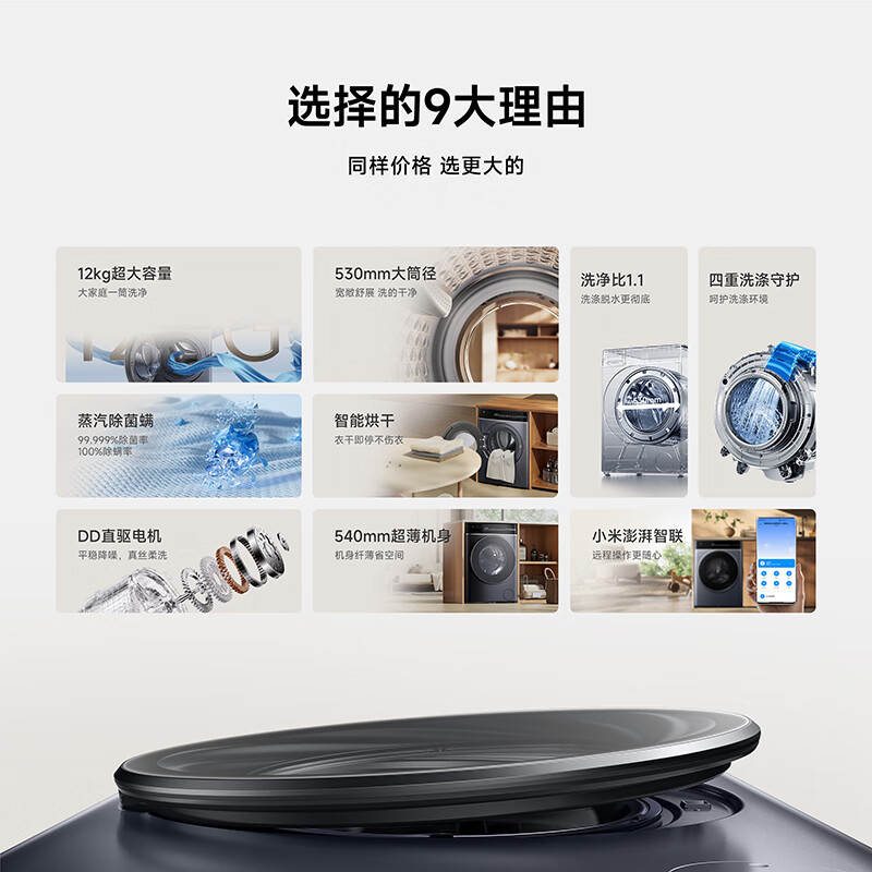 洗衣机已经用了几天了,洗衣效果还不错,很干净,也不容易打结。床单被罩都可以一次性洗,也很节水。这次补贴力度很大,很惠民。洗衣机收货,包装很好,售后安装主动联系,安装及时,安装后能给用户进行操作指导,非常贴心洗衣机米家XHQG120MJ302挺好的,安装师傅比较准时,而且安装也很快,有一台旧的,又买了台新的,专门洗小孩衣服的,便宜又好用,洗得也干净,推荐洗衣机很快就收到了,这个价格真的是太满意了,非常实惠,卖家态度也非常好,喜欢的亲们可以下手了千挑万选 选择了双十一购买这款 价格上有优惠 品牌也有实力 安装上门 大小合适 新家正好需要置办家电 一次买齐大型家电