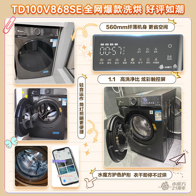 发货遇到一点小插曲,不过第天也是准时送到了。比较静音吧,还可以,刚好有国补价格还是比较优惠的,用一段时间看看,比较高大上特别好,洗衣服变得轻松多了,洗脱烘干一步到位,真是省心。智能风干功能也很赞,衣服干得快。洗衣机小天鹅TD100V868SE收到货啦,外观简洁大方,操作也很方便。特别喜欢它的桶自洁功能,不用手洗就能保持内筒清洁,省心又卫生。洗得干净,噪音小。家里比较小,考虑了好久,量了很久尺寸买了这个,客服很耐心,这几天用得还行,希望用久一点。品牌,来安装师傅是公司,上网一查,原来归集团了,好名字。师傅帮试了机,运转正常。新房还没有去住,没有使用,用后再次评价。