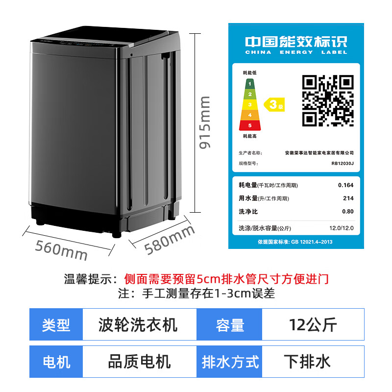 洗衣机荣事达RB12030J哪个好?区别是?这款荣事达(Royalstar)洗衣机 12公斤全自动波轮大容量家用脱水机甩干机洗衣机 以旧换新 深灰色 RB12030J确实可以的哈,奢华的造型设计和外观,做工细腻,不少网友想要知道这款荣事达RB12030J怎么样?性价比高吗?说真心的这款洗衣机荣事达RB12030J体验过一段时间后个人觉得蛮不错的,才购买没多久的,货收到,是线下安装,验收了二维码,是正品。只纳闷的是同时买了一台冰箱就是就近发货,晚上下单,第二天就到了。但是这个冰箱是山东发货过来,走了天。收到后试洗了一下,比较静音。机体确实倩薄。安装人员很负责任,教了如果使用,同事顺便调试了冰箱。(冰箱是因为那天厨房门小了放不进去,就没有让他们安装)。 洗衣机荣事达RB12030J外观是纯白色,挺好看的。颜值特别高。洗净效果挺好的,特别静音。容量大小:的大容量,真的挺大的。除菌效果:效果杠杠的。 用了两次,还不错,用来给小朋友洗衣服用的。品牌值得信赖。衣服别洗太多,一两件会很好用。 质量非常好,完全超出期望值,发货速度非常快,包装非常仔细、洗的很干净,电机动力强劲,价格便宜,值得购买,完全出乎我的想象 波轮洗衣机收到了,质量很好,外观很漂亮,做工精细,材质很好,洗的很干净,品牌质量有保证。