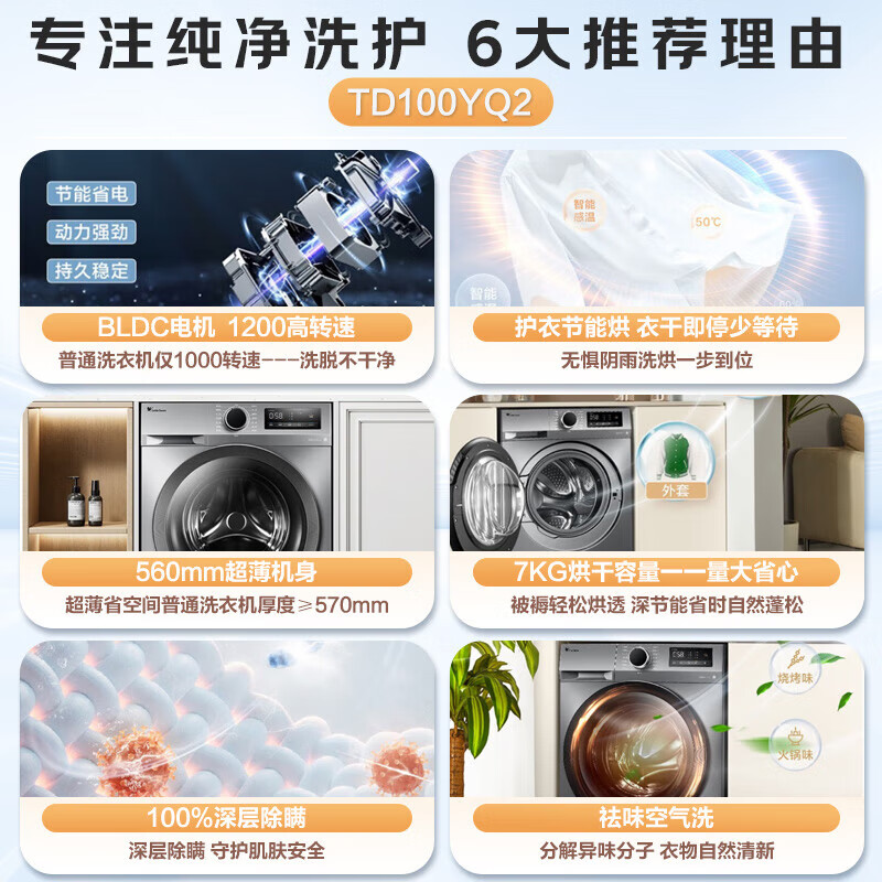 小天鹅TD100YQ2外形外观:外观美观时尚,尺寸比想象中的大一点洗净效果:细的干净,烘干后衣服不硬整体来说适合洗内衣裤或者夏天轻薄的衣服合适物流超级超级快!产品颜值如图所示,质量也非常不错,的确物有所值,期待使用效果更好哦,看了这款机器比较久,目前这个机器主要用于新房,小崽儿的专属洗衣机,东西很喜欢,质量也很好的,这个价格能买到是真的很划外形外观:美观大气颜色是我喜欢洗净效果:洗的很干净除菌效果:暂时还没有用到这个功能。不错?这款洗衣机真是太给力了,超大容量让我一次性洗好多衣服,告别了潮湿的烦恼,洗完衣服干爽又清新,使用起来也很方便!