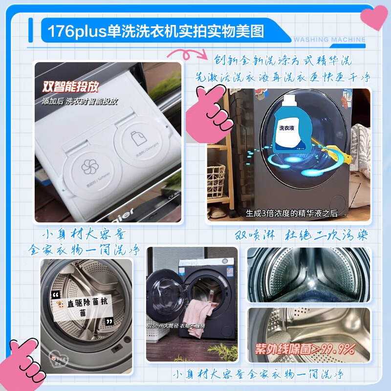海尔XQG100-BD176PLUSLU1外形外观:外观非常美丽洗净效果:洗净效果非常不错除菌效果:除菌效果杠杠地容量大小:容量非常大,家人很喜欢以旧换新:非常不错洗衣机很好用,大小正好放进去,洗衣服声音很小,脱水效果也蛮好的,家里买的第二台了,喜欢外观好看,小巧可爱,不占用地方,大小对出租屋友好,短袖可以洗到件,外套卫衣可以洗一件。用来洗内衣袜子还是很不错的选择。客服总是推诿,不解决实际问题,一拖再拖。连续催促天才送货到家。再也不网购大件商品了。洗衣机挺不错的,体积小容量大,洗衣比较干净,脱水时噪音很小,总之这款洗衣机真的不错,我会推荐给需要的朋友,五分好评。