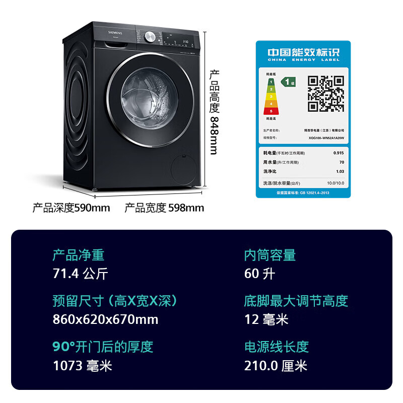 洗衣机西门子XQG100-WN52A1A20W哪个好?有区别吗?其实这款西门子(SIEMENS)iQ300曜石黑 10公斤滚筒洗衣机全自动带烘干 洗烘一体AI智能投放 蒸气除菌除螨 A20W 家电国家补贴不错的 哟,独特的设计造型,做工极其细腻,有网友想了解这西门子XQG100-WN52A1A20W怎么样?谁用过评价?说真心的这款洗衣机西门子XQG100-WN52A1A20W使用体验后个人感觉确实可以的哈,刚入手不久的,入手超值!在实体店一看到就被它的外观等,而且绿色这一款是带烘干的,吸引了,摆在家里像艺术品一样。除了外观,性能也很能打,有分区洗护功能,纳米银离子除菌功能,智能投放洗衣液功能。而且绿色这一款是带烘干的,阴雨天也不用担心衣服不会干了,已经推荐给部分朋友,上门安装的师傅也很耐心、随和,很满意的一次购物! 洗衣机西门子XQG100-WN52A1A20W质量特别好,这款洗衣机真是太方便了,洗脱烘干一体,省时省力。智能风干功能特别实用,衣服干得很快,价格也不算贵,性价比高! 洗烘套很好看,像一体成形的一样,完嵌入家居,声音也很轻,也是赶上好时候,双十一价格低的很 这个洗衣机简直是租房必备,外观很好看,刚刚好大小,而且是老牌子了,很值得信赖,而且洗衣服很干净,风干也很好,非常值得购买 货收到了,京东物流速度就是快。货还没用,看起来是正品。希望好用,过年了人多洗的衣服也多。