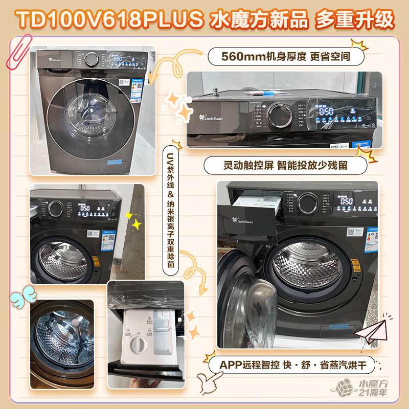 洗衣机小天鹅TD100V618PLUS哪个好?有啥区别?实际上这款小天鹅(LittleSwan)滚筒洗衣机全自动家用 带烘干洗烘一体 水魔方【TD100V618PLUS】10公斤 家电国家补贴20% 以旧换新可以 哈,外观设计非常漂亮,做工还真挺细腻的,不少网友想要知道这个小天鹅TD100V618PLUS怎么样?谁用过评价?说真心的这洗衣机小天鹅TD100V618PLUS体验过一段时间后个人觉得蛮不错的,才入手没多久的,这个洗衣机买回来我还没有用,先给个好评吧,我看一看应该可以,这个洗衣机是给小孩子用的。我觉得应该可以吧,洗净效果:亲亲效果非常棒,我觉得非常的可以。除菌效果:除菌效果的话也非常的棒,有蓝光除菌。容量大小:容量的话稍小,因为它是儿童洗衣机,所以的话大人的衣服还是不要放。外形外观:外观绝绝子,外观绝绝子。 洗衣机小天鹅TD100V618PLUS洗衣机外形外观高瑞大气,漂亮。洗净效果很干净,除菌效果不错,容量够用,适合宝宝的衣服,朋友推荐的,有朋友需要也会推荐。 整体不错,操作中声音很安静,烘干力度够,小巧方便,物流也很快,直接送货上门,不错的品牌 这个牌子也是个老牌子了,非常便宜加实惠,用着也很不错,家人都非常推荐。洗的非常干净。值得推荐。关键是现在优惠力度非常大。 洗衣机操作很简单,洗衣液和除菌液放置简单,选择模式很方便,声音很小,一次很棒的购物体验