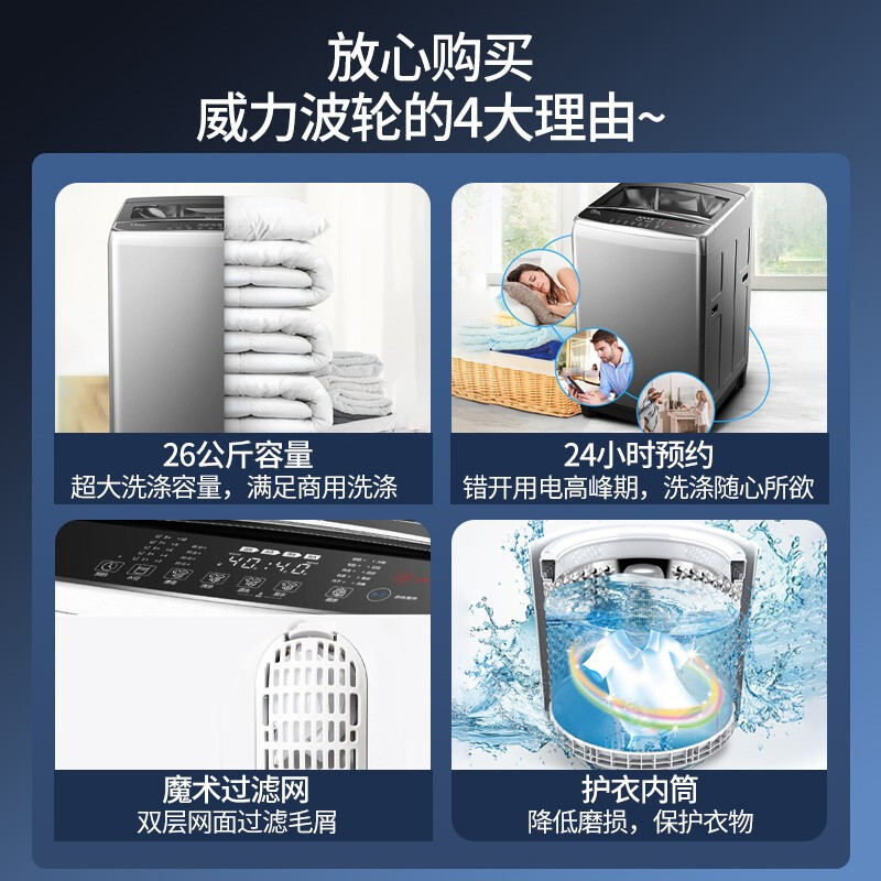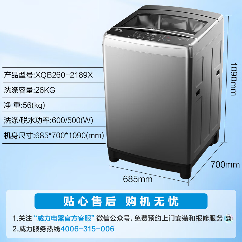 威力(WEILI)26公斤 波轮洗衣机全自动 大容量家用 量衣判水旋洗波轮 预约自编程 优质电机XQB260-2189X毛毯洗到手价格2609.1元。