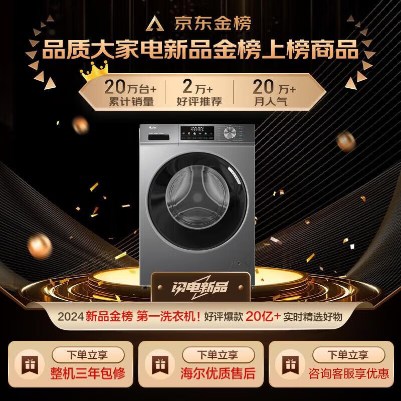 海尔洗衣机EG100MATE29S京东太给力了,上午下单,傍晚到货了。迫不及待的打开并且试用一下,洗衣机操作简单,屏幕显示清晰,做功精细,手感好。非常喜欢。物流快,售后好,师傅上门安装试用,很满意。外观漂亮,大小合适。还没正式用,后续再评。质量很好,容量大,洗衣服一次能洗好多件,特别适合我们一家人。智能洗涤功能也很方便,能根据衣物类型自动调整,省心又省时。家里有一个大的洗衣机,衣服少时感觉费电费水,双又买了这个小的,用着很好,操作也简单。双子我家已经买了两台了,真的很好用。颜值特别高,放家里彰显档次。实用度也高,大件小件分开洗,防止染色也健康。总体很满意