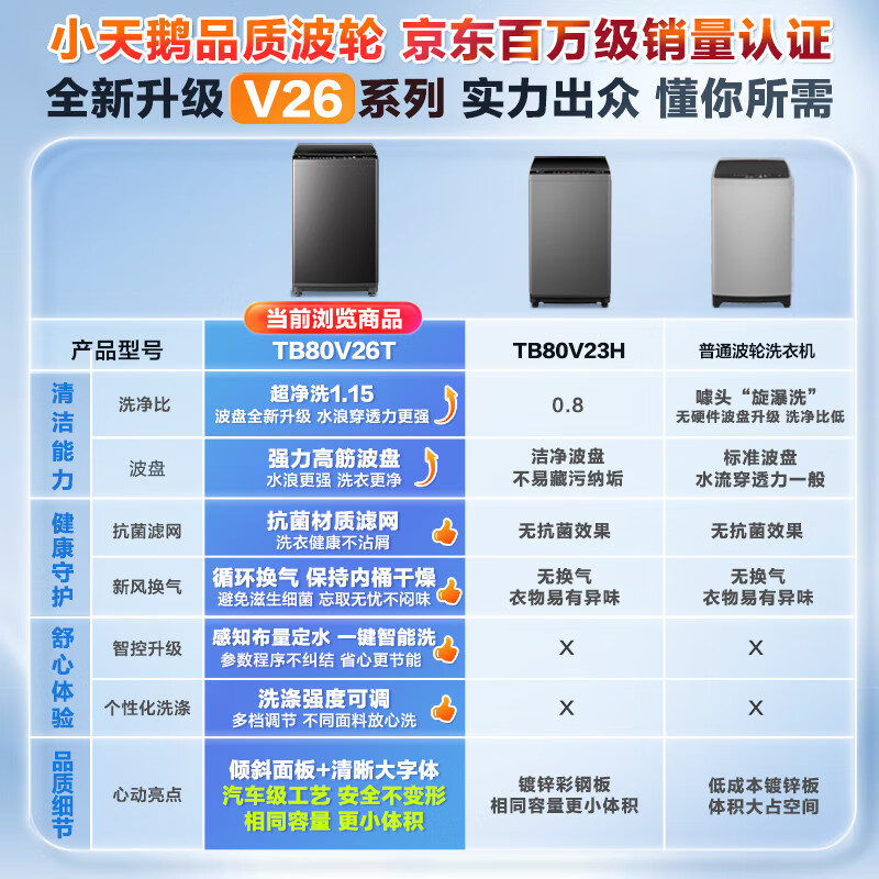洗衣机小天鹅TB80V26T哪个好?区别大不大?其实这款小天鹅(LittleSwan)波轮洗衣机全自动 8公斤 超净洗除菌除螨 宿舍租房神器 以旧换新 TB80V26T 家电国家补贴 以旧换新很nice的,精美的外观设计风格,做工非常讲究,不少人想要知道这款小天鹅TB80V26T怎么样?质量好不好?说真心话这款洗衣机小天鹅TB80V26T使用体验后个人感觉可以的,我自己也是才购买不久的,用了若干年滚筒之后,重新换回了波轮洗衣机。首先价格便宜,容量大能放很多衣物,水量大能漂洗干净,力道大能洗净。不足是洗衣液比滚筒的加得多,比滚筒费水,没有烘干功能,脱水没有滚筒彻底。衣服有缠绕,用洗衣袋完美解决。送货上门之后自己安装,进水管不匹配水龙头,自行购买安装,安装还比较简单。性价比很高的洗衣机。 洗衣机小天鹅TB80V26T东西收到了,看着还可以的,预约了安装,到时候看一下洗涤的效果,看看怎么样,能不能解放双手就靠这个了,希望效果还不错的哈。 很不错呢,洗衣效果真的很满意,操作简单,声音也不大,洗完衣服很干净,使用起来非常方便。 这个价格,比我家里原来洗衣机强太多,也可以自动根据衣服的多少调节洗涤时间,衣服比之前的洗得干净多了,安装师傅点个赞。 非常好,物流给力很快就到了,态度也很好,使用了一段时间,跟描述一样很好用,五星好评!