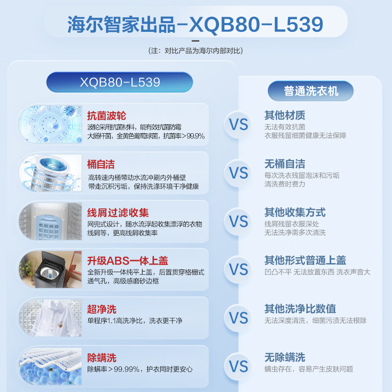 洗衣机统帅XQB80-L539哪个好?有啥区别?其实这个统帅(Leader)海尔智家波轮洗衣机小型全自动 8公斤租房神器 懒人洗衣机以旧换新 家电国家补贴 XQB80-L539确实可以的哟,精美的造型设计和外观,做工很细腻,有网友想了解这统帅XQB80-L539怎么样?口碑如何?说真心话这洗衣机统帅XQB80-L539已经使用过一段时间个人感觉蛮可以 的哈,我自己也是才购没多久的,这款洗烘套装给我留下了深刻的印象。在使用过程中,我发现它的操作界面简洁明了,易于上手。烘干功能也非常强大,能够在短时间内将衣物烘干,避免了衣物受潮发霉的问题。此外,它的噪音控制得很好,即使在夜间使用也不会影响到休息。总的来说,这款洗烘套装在性能、使用体验和性价比上都表现出色,是一款值得推荐的产品。 洗衣机统帅XQB80-L539安装好了,还没入住,之前也买的洗衣机,很好用,质量也好,这次搬新家旧的用了几年了就换了,公斤很大可以洗被子了,期待… 容量大小:正合适,大小衣服棉服都能洗外形外观:外观好看干净洗净效果:洗的干净,强烈推荐 洗衣机收到了,全自动的非常方便,夏天就用小型的洗衣服,省时又省水,洗的还非常干净,而且外观还非常好看,每天都在用,太爱了 太棒了,大小刚刚好!再也不用手洗了!蓝光洗衣,而且也不耗电,洗的也干净,出租房必备?