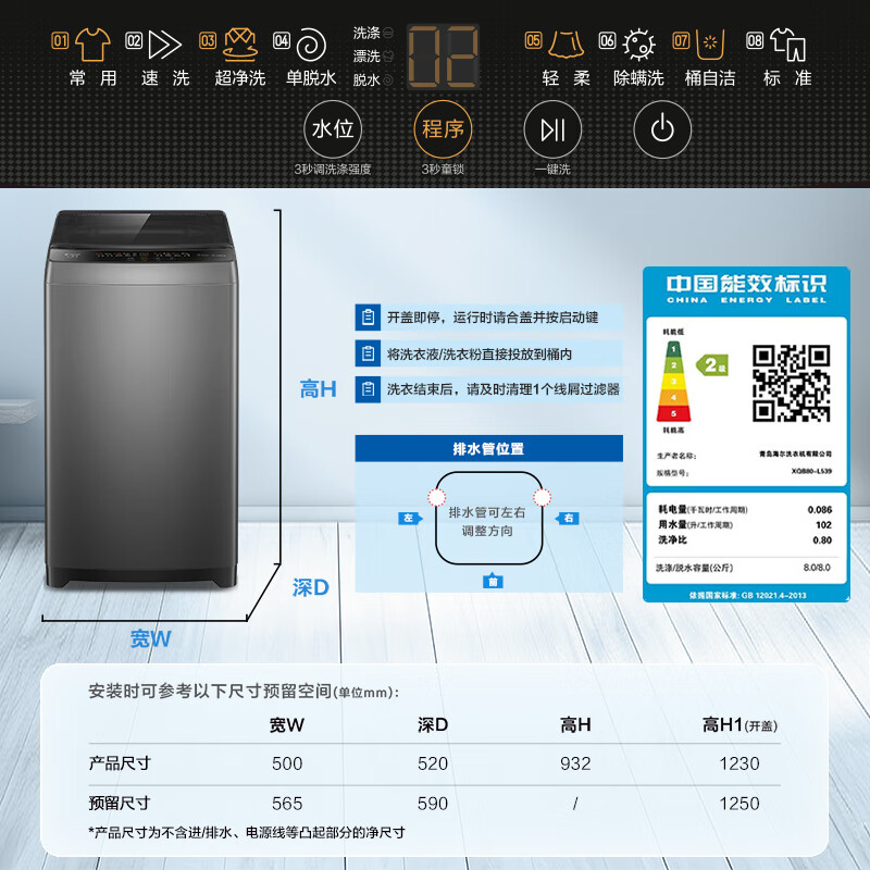 统帅XQB80-L539外形外观:薄款,刚好可以放进我们家的洗手台,颜值挺高,灰色比较高级洗净效果:衣服洗的很干净容量大小:容量大,全家衣服够用不错,颜值很高,智能化操作很方便,外形外观:颜值很高,看着好看容量大小:容量超大,很方便宝宝洗衣机大小合适,不占地方,很方便,有标准洗分钟,快洗分钟,童洗分钟,除螨分钟,高温煮洗分钟等功能,总之很不错很方便。颜值很好,使用起来非常的静音,外形让人眼前一亮,安装师傅上门安装也非常快,购物体验很不错一收到货,就立马拿了衣服试一下,整体洗衣服比较安静,甩干的时候晃动也不会太大,比之前那个安静非常多,整体还是很满意的。