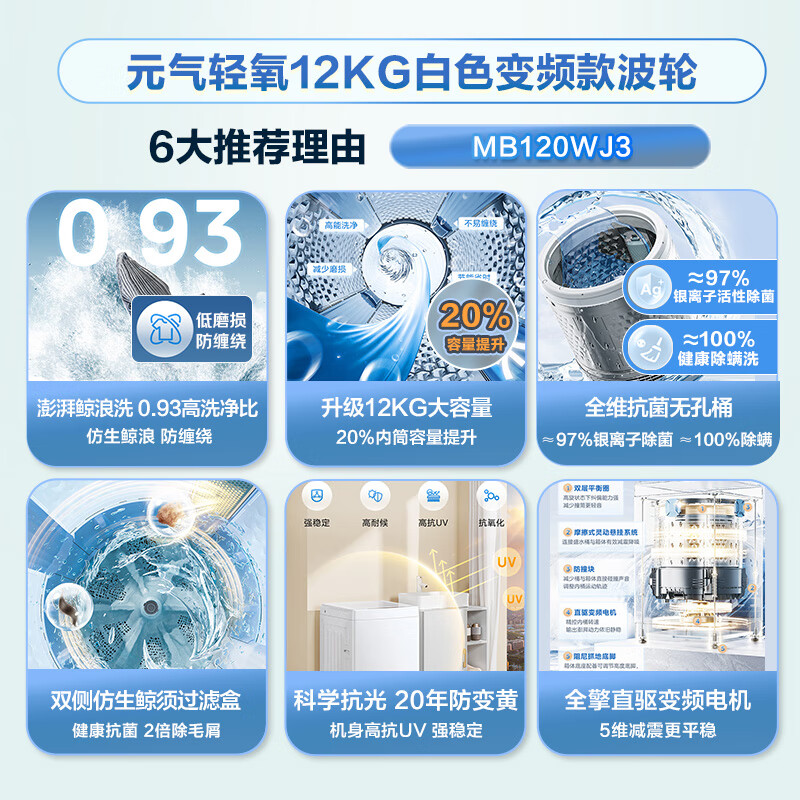 洗衣机美的MB120WJ3哪个好?区别是?其实这款美的(Midea)波轮洗衣机全自动家用 小白鲸MB120WJ3 12KG大容量元气轻氧 直驱变频 以旧换新 家电国家补贴20%可以的,独特的设计和外观,做工非常细腻,不少的人想要了解这款美的MB120WJ3怎么样?评价好吗?说实在的这洗衣机美的MB120WJ3个人使用过一段时间后感觉蛮可以的哈,刚购不久的,入手了洗烘套,体验感超棒!洗衣机洗净效果出色,多种洗涤模式很实用,运行安静平稳。烘干机更是亮点多多,烘干速度快,烘完的衣服干爽又蓬松,绒毛收集功能超赞,能把衣服上的绒毛清理得干干净净。而且洗烘过程中还能除菌除螨,守护家人健康。这一套真的太值了,让日常洗衣烘干变得轻松又高效,必须给个好评! 洗衣机美的MB120WJ3买给租客用的,选了款性价比高的,公斤的容量日常也够用了,目前来说使用过程很满意,白色的造型也很百搭,公斤很窄,很好看 洗机收到了,外观很好看,洗的也很干净,没有噪音,使用也很方便,客服态度很好,值得购买哦! 终于到了,效果就是阔以,便宜实惠,这是买的第二台,家里人喜欢这个,都不需要师傅装,自己框框的搞定了,后面还给村里亲戚买了 速度可以,干净程度也可以,很推荐大家购买,公斤真的很大,比三公斤实用太多了,价格很合适。