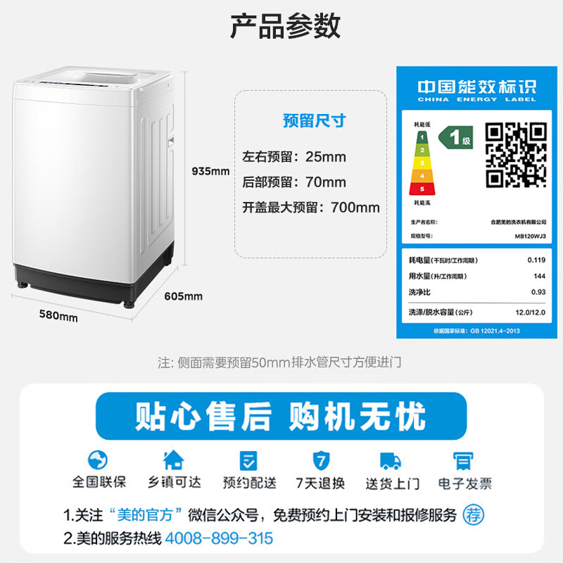 美的MB120WJ3洗衣机外观不错,容量大且送货上门。安装前已电话沟通,整体体验良好。待衣物洗涤后,方能判断清洗效果,一般应都能洗净。期待烘干好评,质量好,穿着舒服,款式好看,价格实惠。很好,物流很快,东西很给力,性价比很高!洗衣机老牌子了,外形外观设计好看,洗衣服比较干净,一家四口容量刚好,物流很快,下单第二天就能到货了,值得推荐给大家!买来专门洗宝宝的衣服,洗衣桶看着小,比想象中的要能装,洗衣机声音可接受范围,操作简单这款洗衣机的洗衣功能非常出色,洗衣声音较小,洗得干净,使用方便,且颜值较高。能够洗一大家子的衣服,以旧换新还能抵点金额。