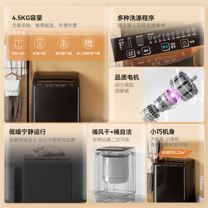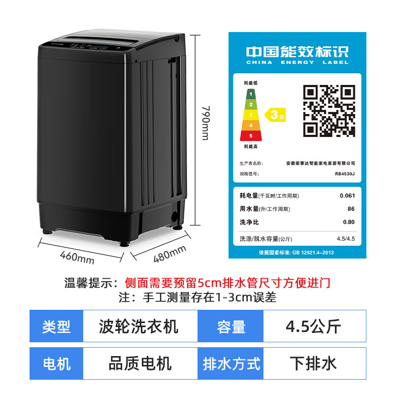 荣事达(Royalstar)4.5KG波轮洗衣机宿舍租房神器小型迷你全自动洗衣机 一键脱水 小型便捷波轮 以旧换新 RB4530J到手价格479元。