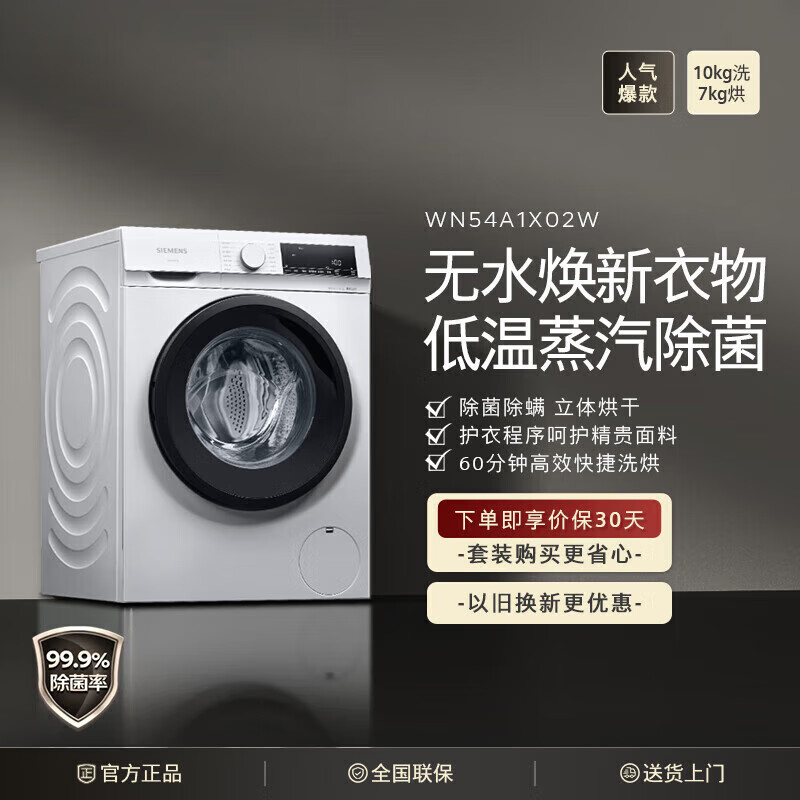 西门子(SIEMENS)10公斤滚筒洗衣机全自动带烘干 洗烘一体 热风除菌 蒸气祛味 智能烘干 WN54A1X02W 家电国家补贴到手价格4299元。