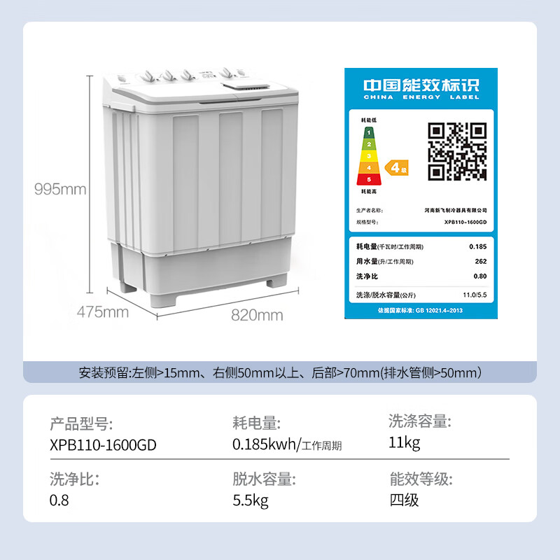 洗衣机新飞XPB110-1600GD哪个好?区别是什么?这个新飞(Frestec)11公斤半自动双缸洗衣机 大容量租房宿舍 快洗快脱 品质电机节能省电 XPB110-1600GD确实是蛮可以的哟,奢华的外观设计风格,做工还真挺细腻的,很多朋友想了解这个新飞XPB110-1600GD怎么样?牌子好吗?说实话这款洗衣机新飞XPB110-1600GD个人使用过一段时间后感觉蛮可以的哈,我自己也是才购买没多久的,满意很好的卖家,非常非常不错,价格不错,看了几家买这个简直太划算了,一次非常愉快的购物体验,产品颜值高,操作友好,比旧的功能要多一些,方方正正,造型美观,各个地方都非常美观,可调节的,有两个档位,很高大上,老公开心的转圈圈,外观大方时尚,态度非常和蔼,安装速度很快,卖家的贴?让我感到很温暖,隔天到速度快, 洗衣机新飞XPB110-1600GD首先,外观非常大气,大显示屏,大旋扭,然后洗衣效果也是非常棒,功能比较丰富,我看这个机型也是非常热门,确实物有所值。 洗衣机收到了质量蛮好的,价格便宜,送货上门很方便,带蓝光和风干功能,这个价格值,满意 ?宝贝收到了,很惊喜,设计合理,时尚大方,继续关注,以后会回购的?挺好的,用着也还行,小两口家庭完全够用,关键还便宜 特别好,洗的很干净,而且噪音也小,建议去买它,准备再买一个放家里,还是送货上门,不用去拉