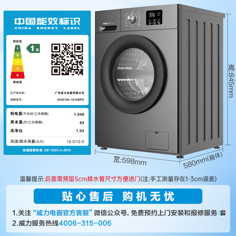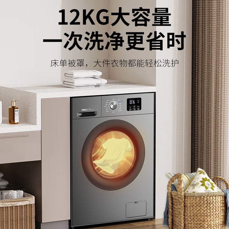 威力(WEILI)12公斤滚筒洗衣机 大容量一级能效 高温除菌 15分钟快洗LED显示屏送装一体XQG120-1216DPX国家补贴到手价格1349.1元。