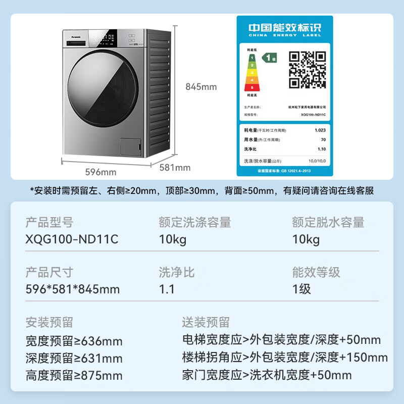 洗衣机松下XQG100-ND11C哪个好?有没有区别?这个松下(Panasonic)全自动洗衣机滚筒10公斤洗烘一体泡沫净光动银除菌1.1洗净比双极除螨变频XQG100-ND11C国家补贴蛮可以的哈,设计造型不同凡响,做工十分考究,不少人想要知道这个松下XQG100-ND11C怎么样?做工如何?说真心的这个洗衣机松下XQG100-ND11C体验过一段时间后个人觉得可以的哈,刚买没多久的,外形外观:外观设计小巧精致,颜色高雅大方,浴室空间有限,特意选择一款占地面积小而且可以满足基本洗涤需求的洗衣机洗净效果:洗了衣服和床单被罩,效果很好,而且彻底解放了双手除菌效果:加了消毒液,除菌效果可以容量大小:.公斤刚刚好,主要解决床单被罩和厚衣服的洗涤,噪声也不大,从此以后洗涤重任都交给它了 洗衣机松下XQG100-ND11C一直使用洗衣机,.活动性价比高。使用感受很好。脱水蛮静音的。外观大方美观,公斤清洗一套床上用品没问题,安装师傅态度也很好 外形外观:好看洗净效果:洗得干干净净.除菌效果:效果真的很好容量大小:非常大:很静. 物流快,包装完好无损。用了几天感觉很不错,波轮设计确实护衣,洗得干净又不伤衣物。大容量很适合全家使用,一次能洗不少衣服。 外形外观:非常好看大气,蓝黑色,很洋气容量大小:挺大的,洗烘一体,等用过之后试试效果