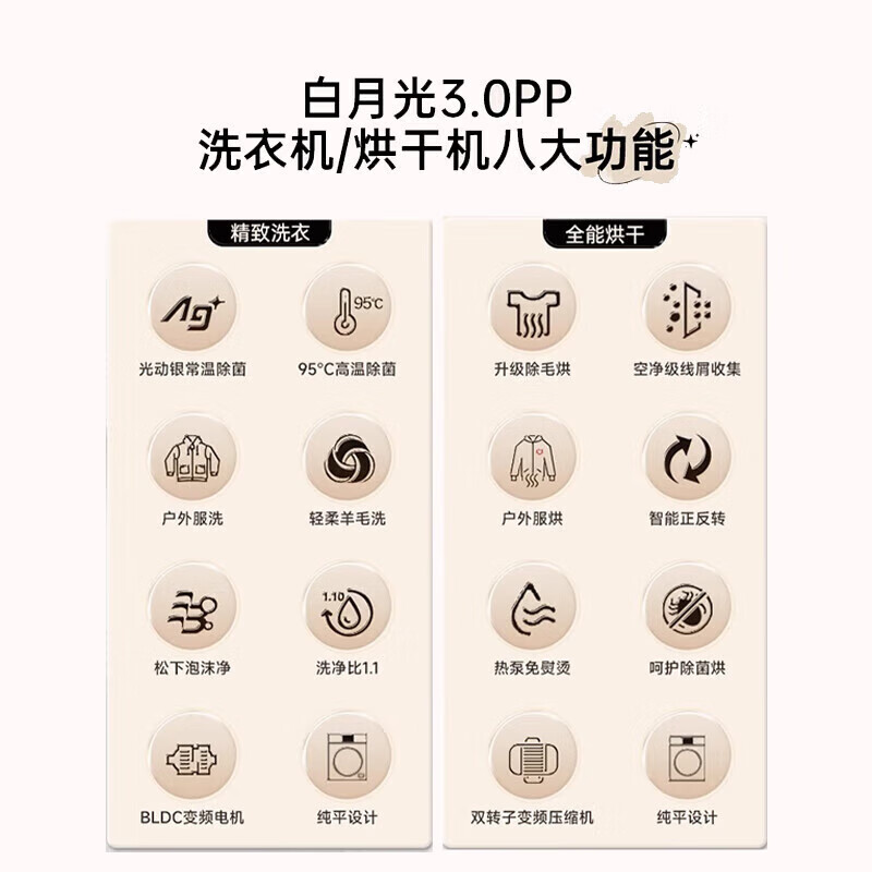 松下(Panasonic)白月光4.0轻享洗烘套装10kg滚筒洗衣机泡沫净光动银除菌+热泵烘干机双转子变频压缩机 N3K1+N1KR2到手价格8999元。