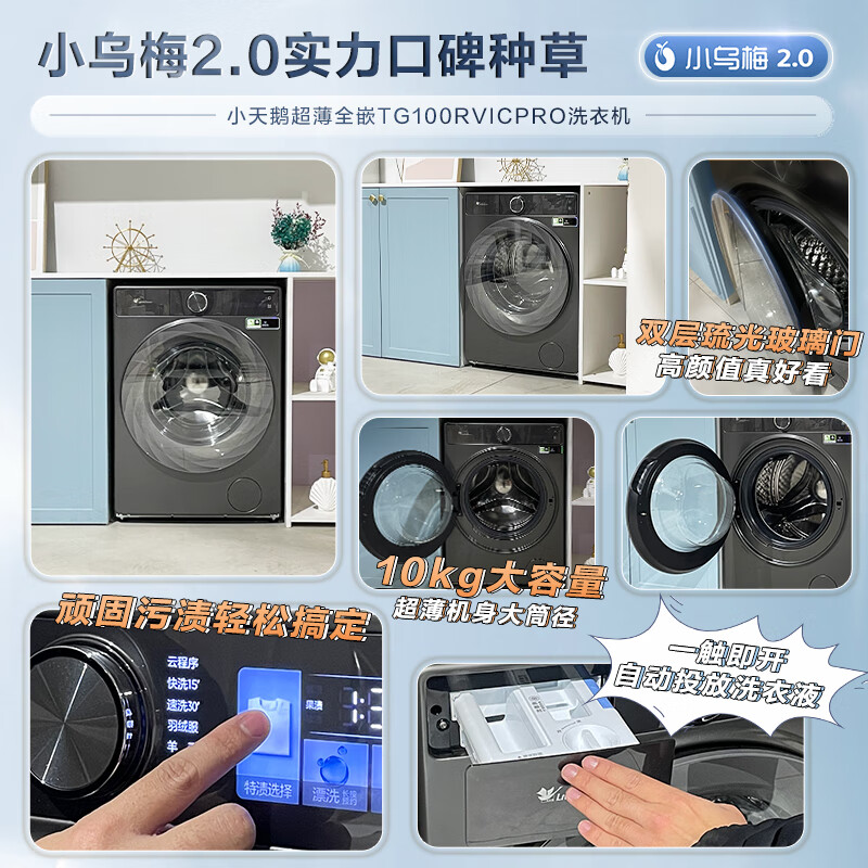 洗衣机小天鹅TG100RVICPRO哪个好?有区别吗?实际上这个小天鹅(LittleSwan)滚筒洗衣机全自动家用【小乌梅2.0 TG100RVICPRO】超薄10公斤 家电国家补贴20% 以旧换新 一级能效的确非常nice的,优雅的造型设计风格,做工极其细腻,很多人想知道这款小天鹅TG100RVICPRO怎么样?谁用过评价?说实在的这洗衣机小天鹅TG100RVICPRO体验过一段时间后个人觉得蛮可以的,刚入手没多久的,外形外观:好看,有档次洗净效果:很好,洗的干净除菌效果:煮洗功能杀菌没问题容量大小:适当,能洗三个短裤没问题越来越依赖科技了,受够了天天洗短裤烫短裤的苦,之前买了个洗袜子的,这个专门用来洗毛巾,短裤,煮洗功能太好了,洗完短裤还是热乎的,满满的安心,知名的老品牌,质量技术都让人放心。从此生活更加舒适了。 洗衣机小天鹅TG100RVICPRO这款洗衣机颜值很高,智能操控,声音不大,而且还能高温煮洗消毒,效果不错 ,价格合理,性价比高,安装很快。推荐大家购买哈! 一如既往的好品质,非常喜欢的一款产品,非常棒!(* ̄幔*)质量挺好,物流也很快,赞! 全自动洗衣机收到了,免清洗,外形简约,尺寸大小合适。当天到货后,师傅当天上门安装。很方便。公斤的容量家庭洗衣足够了。 洗衣机送回来了,外观非常漂亮好看,功能也很实用,功能按键非常多,值得购买,非常好,点赞