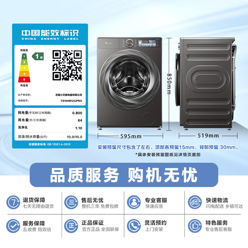 小天鹅TG100RVICPRO家里好几件电器都是在这家买的,刚好看到做活动就买来试试,没想到很好用,容量大,功能多,洗的还干净转速高,排水也挺快的?小洗衣机非常棒,是我想要的,容量大,声音小,动力大,洗的特别干净,脱水效果好,值得购买!这款洗衣机外观漂亮,动力强劲,容量大洗衣干净,脱水也桶也好。我上个洗衣机也是这个品牌,用了近十年,所以十分信赖这个品牌。物流快,使用体验很好,洗衣效果棒,容量大,家里衣物一次性洗得很干净。自洁功能让人更放心。非常好,机器设备很安静,外观设计风格简约,内桶够大,性价比超高,安装方便。送货师傅和安装师傅态度都很好,值得大家放心购买!