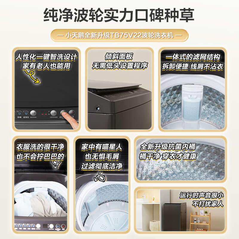 洗衣机小天鹅TB75V22哪个好?有何区别?这款小天鹅(LittleSwan)波轮洗衣机全自动 7.5公斤 深层净洗 一键智洗抗菌除螨 宿舍租房神器 免清洗 以旧换新 TB75V22确实是很nice的,超凡的外观设计风格,做工蛮讲究的,有一些网友想要了解这款小天鹅TB75V22怎么样?上档次吗?说真心的这个洗衣机小天鹅TB75V22个人使用过一段时间后感觉确实可以的哈,刚购买不久的,给新装修老破小学区房购买洗哄套,之前比较心水.但在山姆看到实体机后,总觉得少点啥感觉。正好看站关注家电博主推荐清风明月.瞬间被外形种草,给老婆商量后,果断预定,月号付款拿下,几天后顺利安装,颜值高,功能好,绿标蓝标认证,单电源单出水,超薄尺寸,一切都正正好。虽然入住老破小,也不负人生清风明月好时光。 洗衣机小天鹅TB75V22这次购买的商品质量非常好,完全符合高品质的标准。使用起来得心应手,而且没有任何质量问题,太棒了!外观也特别好看,棒哒! 的,太小太小了,只适合给小孩子洗小衣服!一件成人的袄甩干桶都放不下!一定要选大型号的! 是大牌子了,可以说是家喻户晓,这次也是买了这一款,用着挺不错的说呢,各方面都很棒,当然不得不提的是京东的送货速度,超级快 外形外观:简洁大方,颜值高洗净效果:衣服洗涤很干净除菌效果:除菌效果好容量大小:三口够用