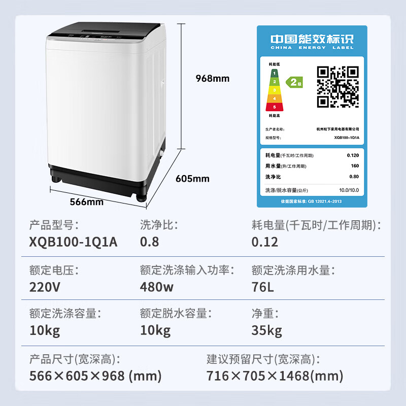 松下(Panasonic)波轮洗衣机全自动家用10公斤大容量节能省电省水快速洗轻柔洗桶自洁风干防霉XQB100-1Q1A国家补贴到手价格1119.2元。