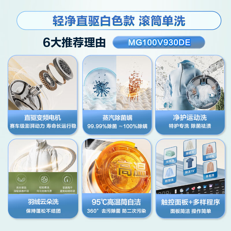 洗衣机美的MG100V930DE哪个好?有没有区别?这款美的(Midea)滚筒洗衣机全自动家用 MG100V930DE 10公斤直驱变频 轻净直驱系列 蒸汽除菌螨 筒自洁 以旧换新确实蛮可以的哟,独特的造型设计风格,做工十分细腻,不少的人想要了解这美的MG100V930DE怎么样?评价如何?说真心话这款洗衣机美的MG100V930DE使用过一段时间后个人觉得可以的哈,才买没多久的,洗烘一体机给我带来了极大的便利。在使用过程中,我发现它的烘干效果非常出色,衣物干燥且不缠绕。同时,它的操作界面简洁直观,即使是初次使用也能轻松上手。此外,它的噪音控制也做得很好,不会影响到日常生活。总的来说,这款洗烘一体机性能优异,使用体验佳,性价比高,我会强烈推荐给需要此类家电的朋友们。 洗衣机美的MG100V930DE发货很快,包装很好,给送货上门,特别省心,客服回答问题很快,都能够很好的解决,洗衣机质量很好,没有破损,容量大小正合适, 东西不错的,安装师傅也很到位,我相信的品质,很多酒店也用这个品牌,老婆也很喜欢。哈哈 精挑细选的洗衣机收到了,直播间主播介绍此款洗衣机挺好,功能挺多,收到后很满意。安装师傅及时给安好了,还没使用,效果很期待。 外形外观:很好看,外观小巧洗净效果:很干净除菌效果:不错,没有异味容量大小:一个人足够