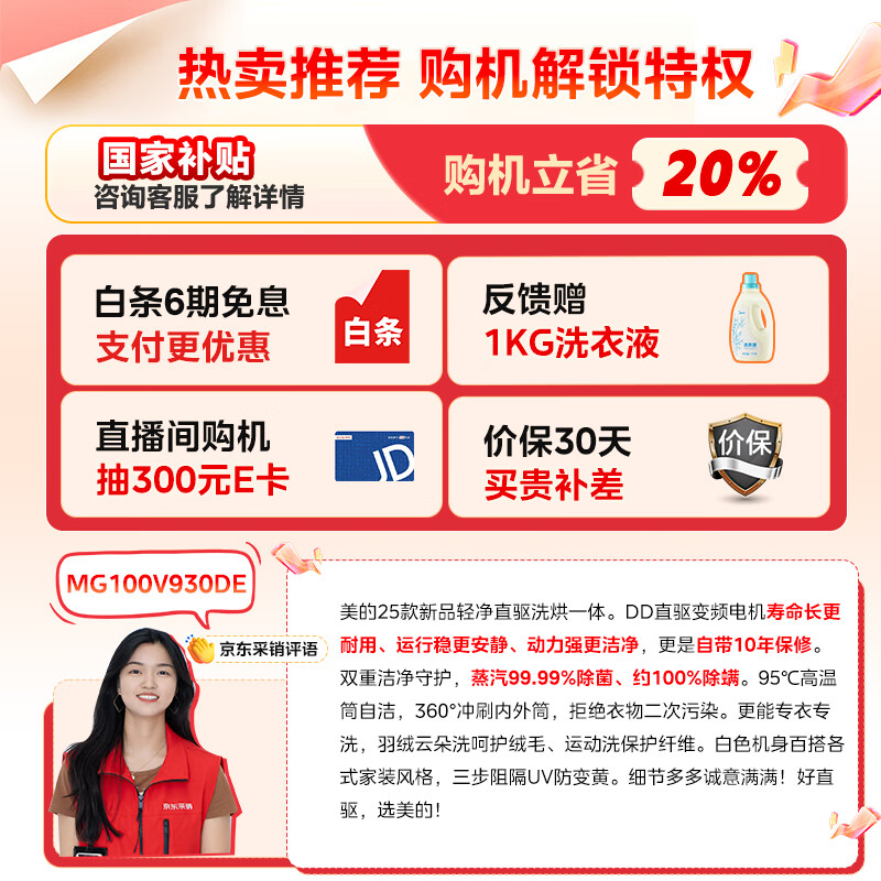 美的(Midea)滚筒洗衣机全自动家用 MG100V930DE 10公斤直驱变频 轻净直驱系列 蒸汽除菌螨 筒自洁 以旧换新到手价格1699元。