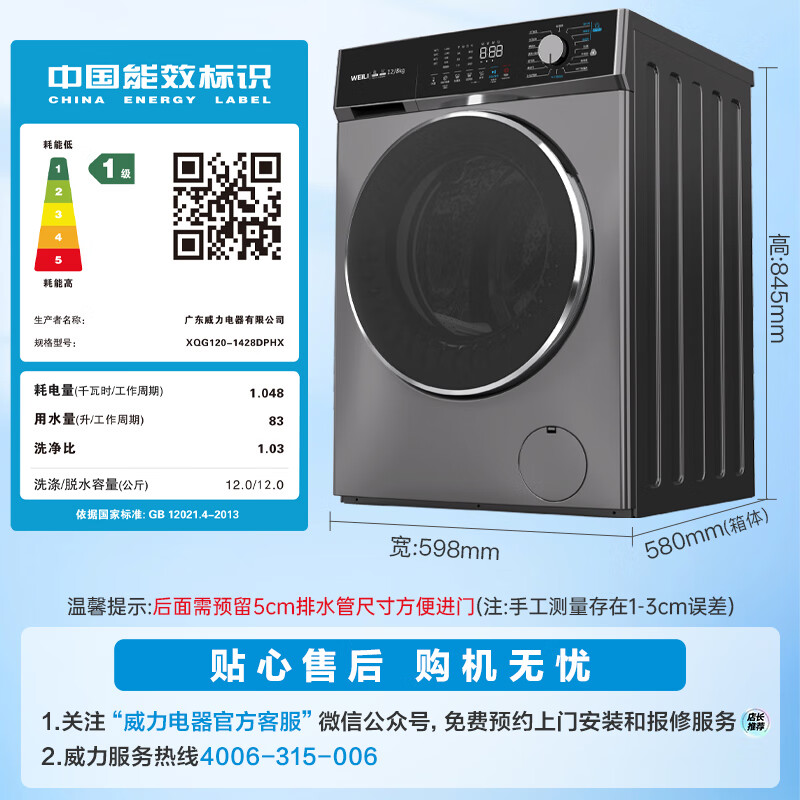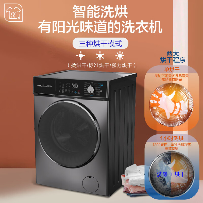 威力(WEILI)滚筒洗衣机 12KG变频大容量洗烘一体 祛味空气洗蒸汽除菌 BLDC 送装一体XQG120-1428DPHX国家补贴到手价格1979.1元。
